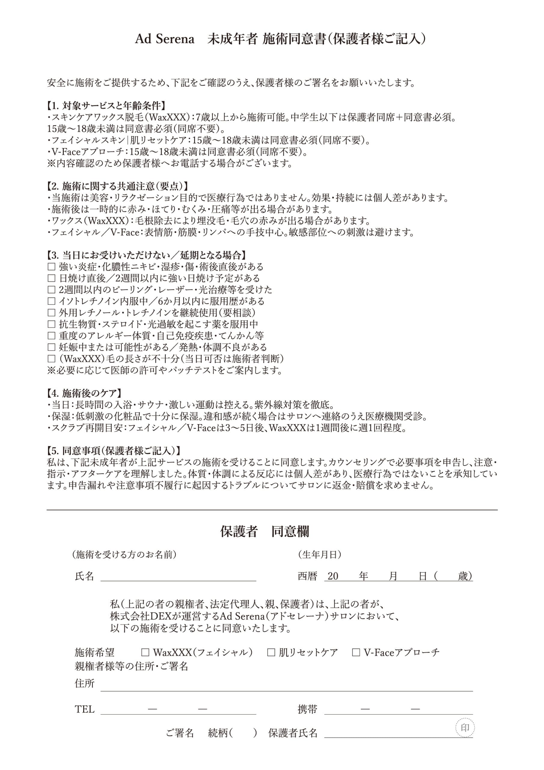 未成年の方(18歳未満)は親権者様の同意書が必要になります。【こちら】から内容を事前にご確認・ご記入の上、施術当日にご持参ください。